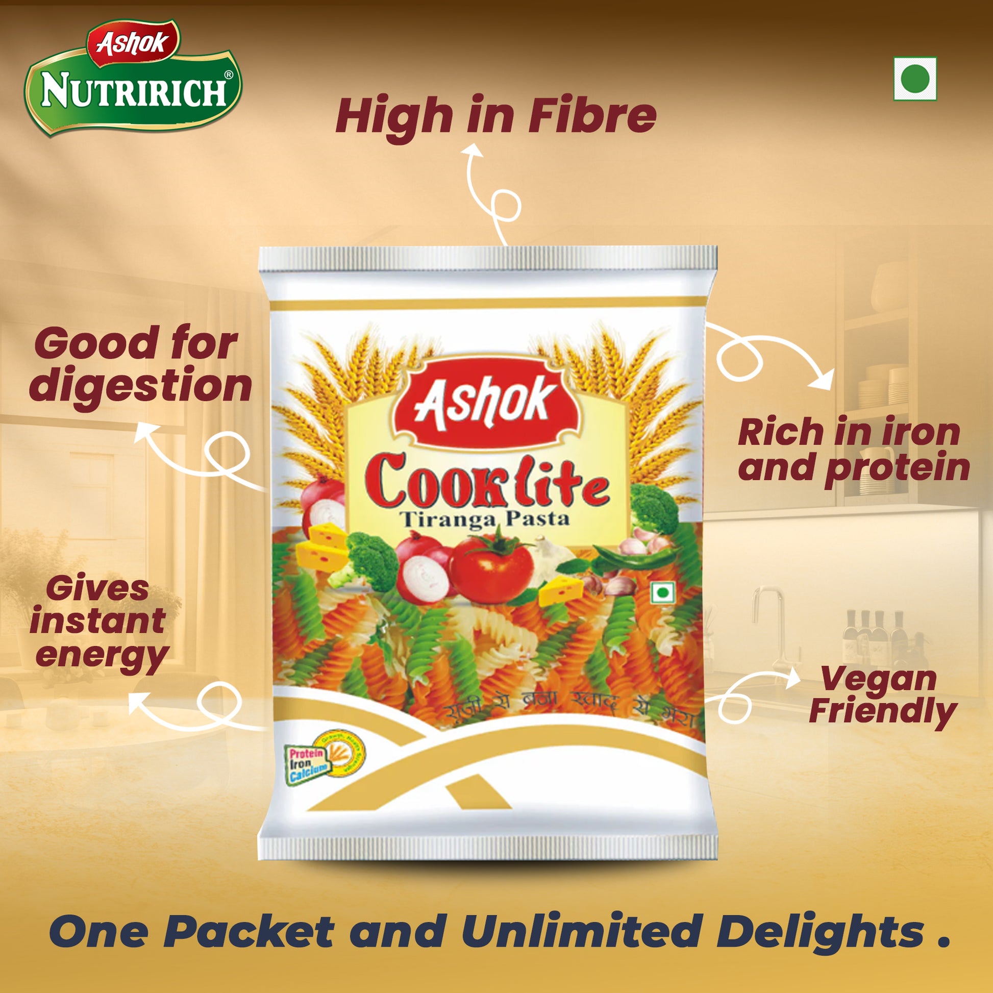 Celebrate flavors and colors with Ashok Cooklite Tiranga Pasta! Made from premium-quality ingredients, this colorful pasta β in shades of orange, white, and green β not only looks vibrant but also delivers a delicious taste. Perfect for kids, parties, or festive meals, this pasta cooks quickly and is ideal for a variety of sauces and recipes. With this pack of 2, bring more joy and nutrition to your plate!