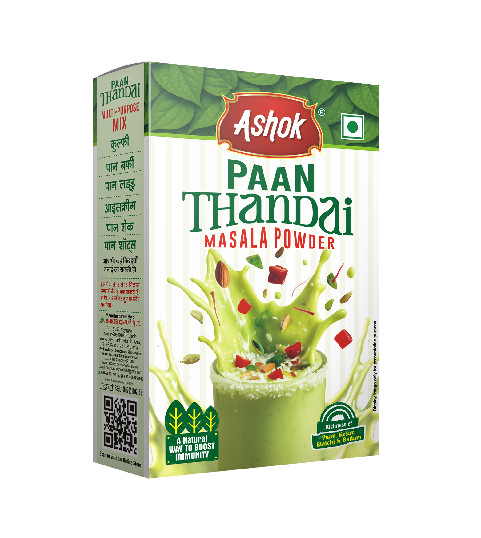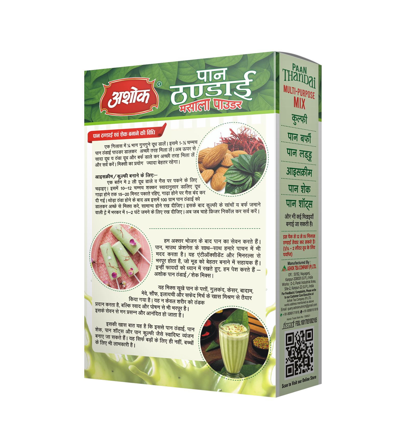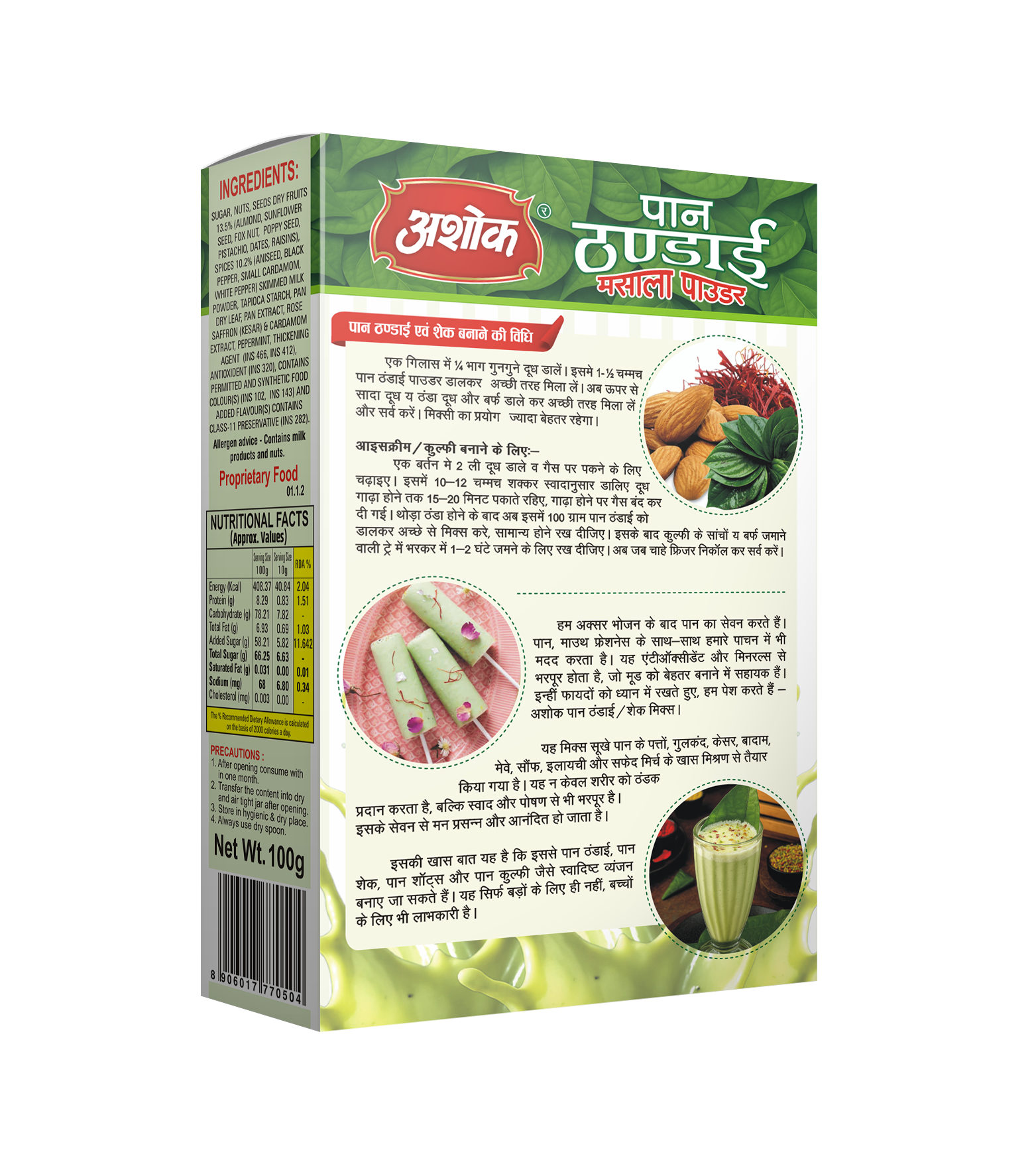Beat the heat and uplift your senses with ASHOK NUTRIRICH Pan Thandai Masala Powder, a premium blend of dry fruits, spices, rose petals, and natural herbs β enriched with the delightful flavor of paan (betel leaf).